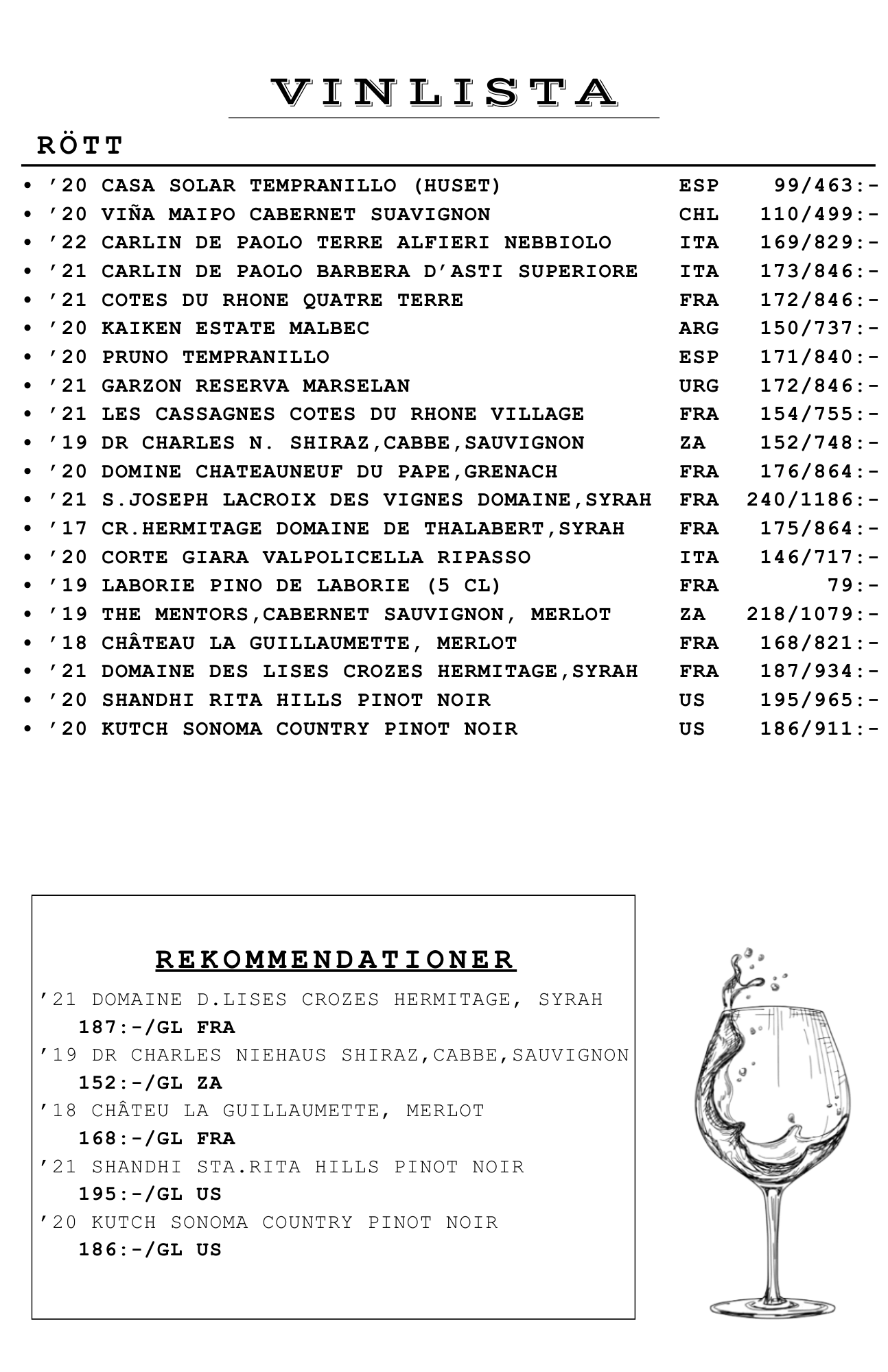 Djup rubinröd, fruktig (körsbär), torr, fyllig med balanserad syra och viss ekton.